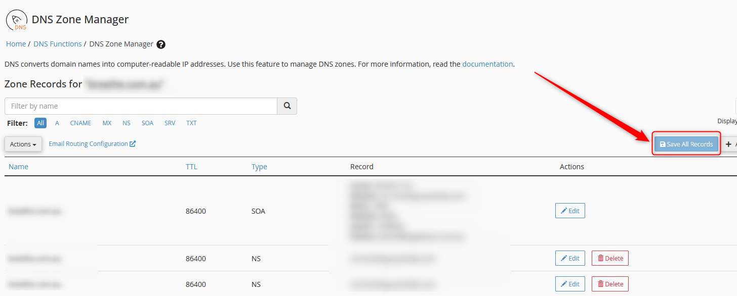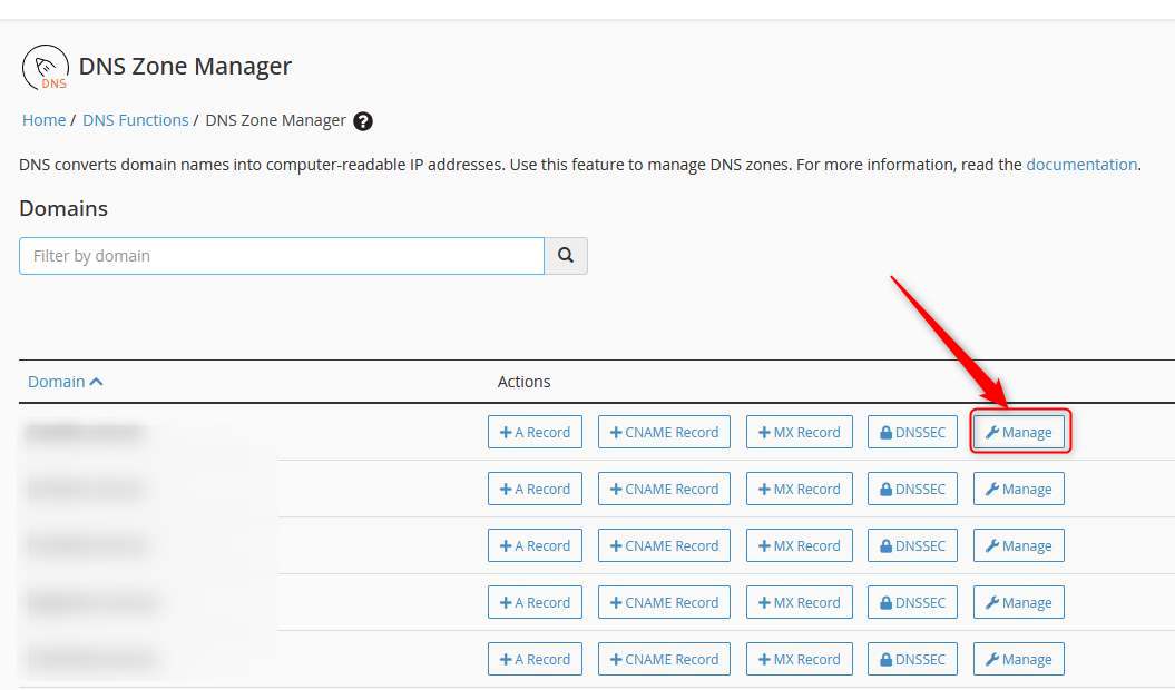 - In the DNS Zone Manager screen, click MANAGE next to the domain you wish to enter.
