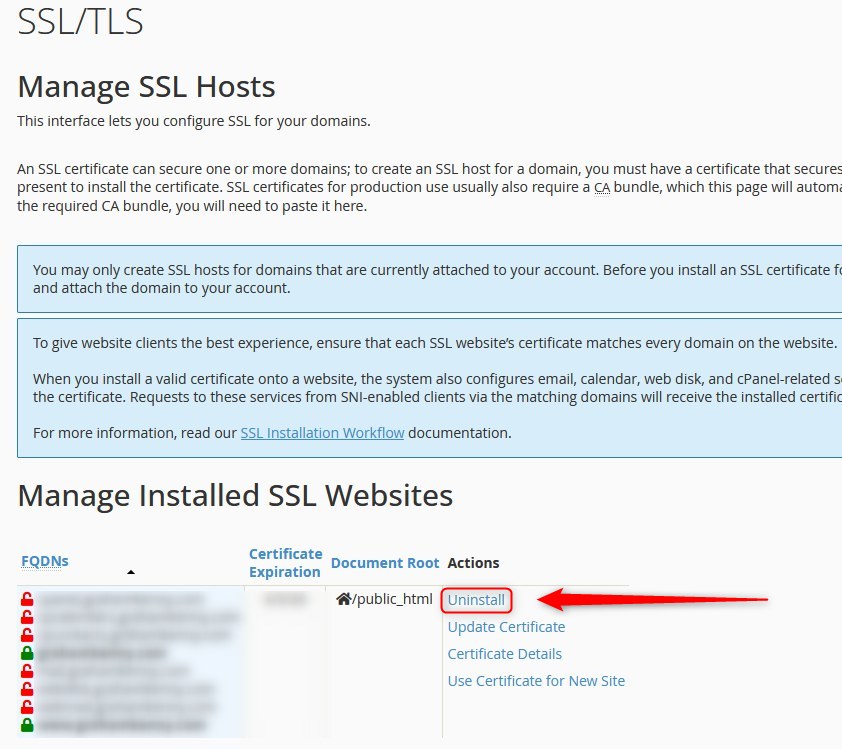 - Under the heading Manage Installed SSL Websites locate the SSL you wish to remove, and then click "uninstall".